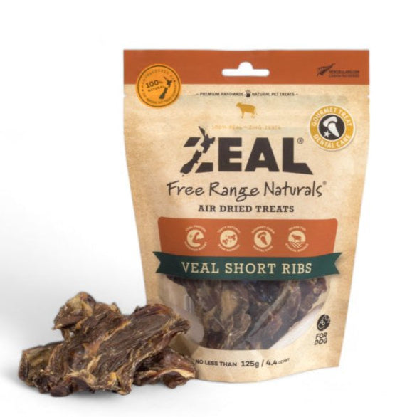 Zeal 125g Veal Short Ribs are premium single-ingredient dental chews made from 100% free-range New Zealand veal short ribs. Featuring high meat content, soft bone, and exposed marrow, these treats provide a satisfying crunch that encourages natural chewing behavior.